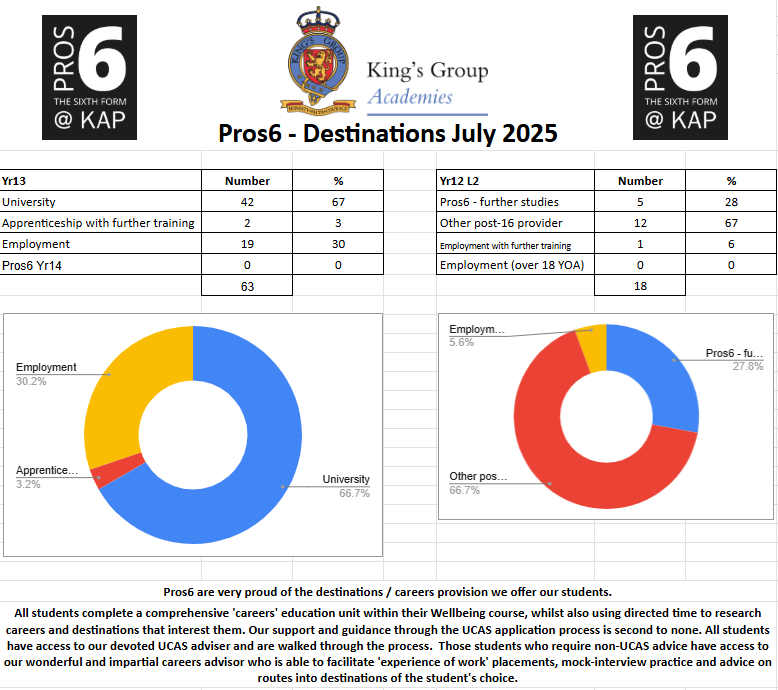 We are incredibly proud of the destinations our Pros6 students progress onto each year. The sheer variety and outstanding quality of these next steps are a true testament to both the first-class advice and guidance offered by our dedicated Pros6 staff and, most importantly, the unwavering determination and hard work of the Pros6 students themselves.